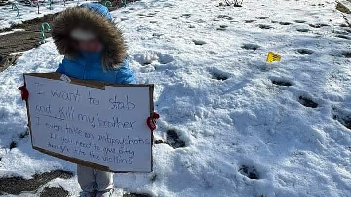 ‘I want to stab and kill my brother, I even take an antipsychotic. If you need to give pity, then give it to the victims,’ the sign read