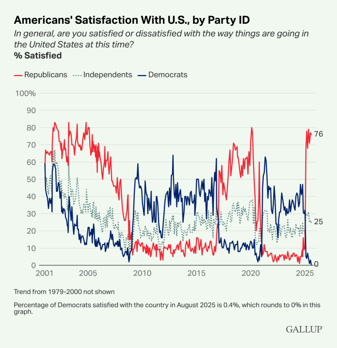 Less than 1% of Democrats say they are satisfied compared to 76% of Republicans, marking a 75-point gap, the largest Gallup has ever recorded on this measure. By comparison, independents are closer to Democrats, with 25% satisfied.