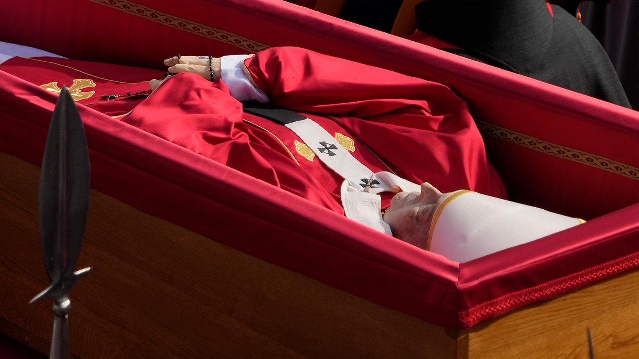 The body of Pope Francis is placed into St. Peter’s Basilica at the Vatican, Wednesday, April 23, 2025, where he will lie in state for three days. (AP)