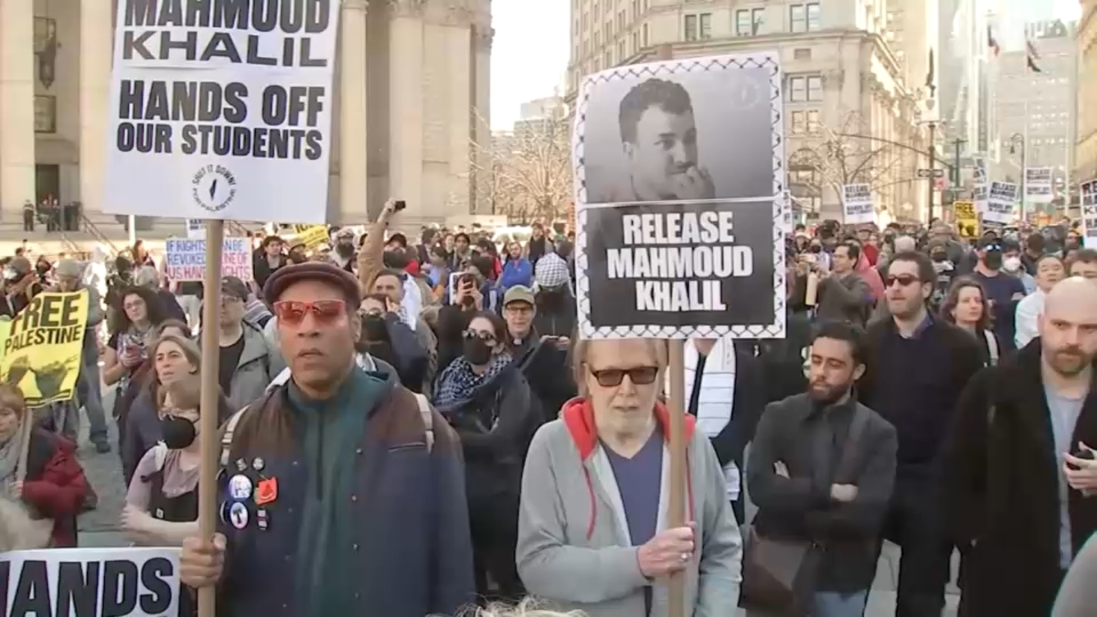 Demonstrators carried signs that said, “No political prisoners in the United States” and “Release Mahmoud Khalil.”
