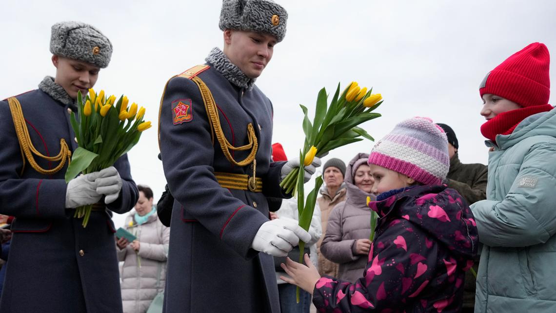 In Russia, the women’s day celebrations had a more official tone, with honor guard soldiers presenting yellow tulips to girls and women during a celebration in St. Petersburg.