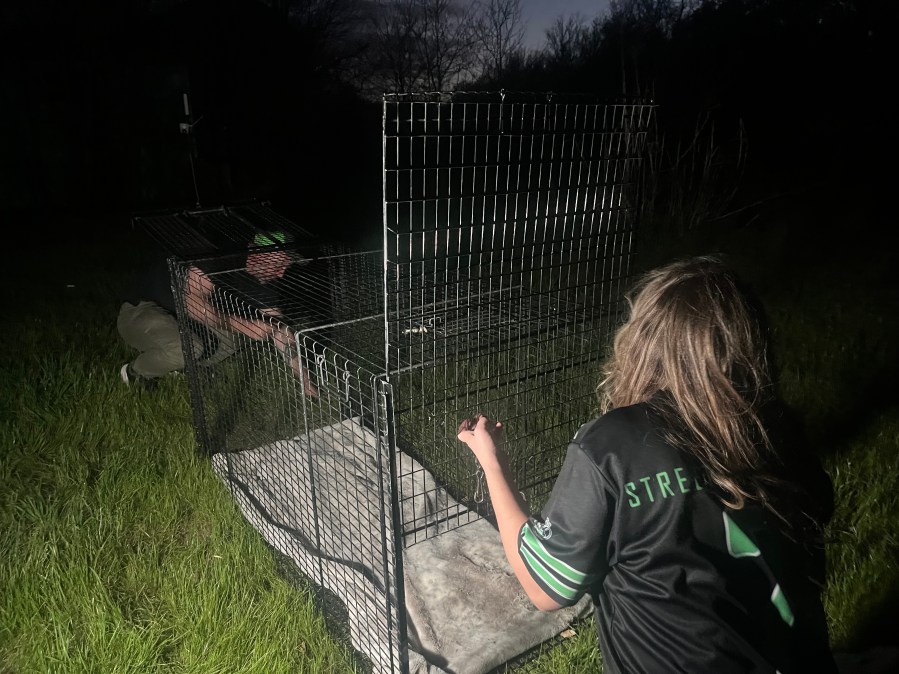 Sasha and her husband setting up a kennel to trap and rescue a stray (KXAN Photo/Avery Travis)
