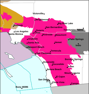 The National Weather Service has issued a Red Flag Warning (shown in pink on the map) for parts of San Diego County from Monday through Wednesday (Photo: National Weather Service San Diego)