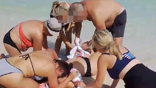 Shocking picturesĀ show people who appear to be the woman's family helping to stem the blood flow as she lies injured on the beach