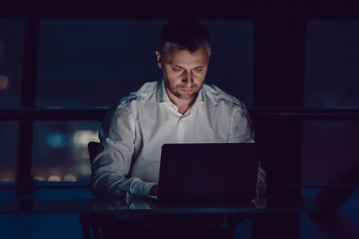 Businessman working on a laptop in a dimly lit office at night.