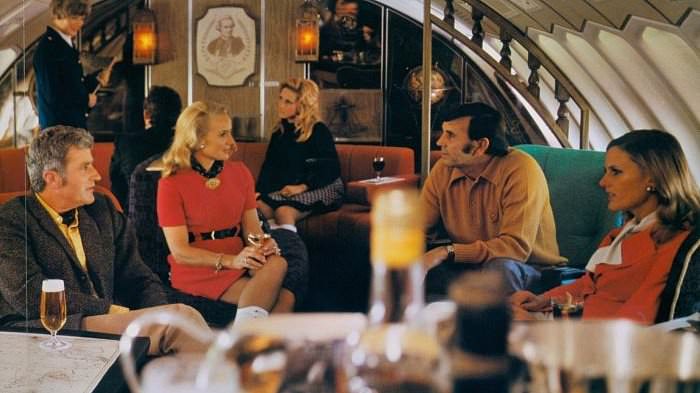 Pictured: 1970s era promo photos from United Airlines depicting their onboard lounges