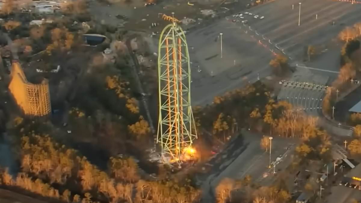 Shocking aerial footage captured the moment multiple explosions at the base of the coaster triggered its backwards collapse, sending it crashing to the ground in a cloud of dust as it shattered into thousands of green-steel pieces.
