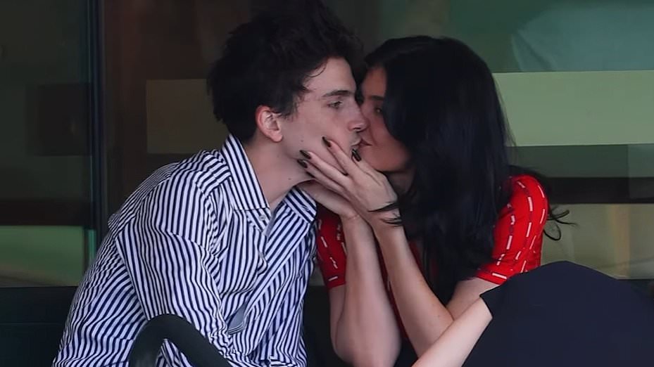 ‘Kylie uses cupped hands to try to pull his head round for a kiss while Timothee looks totally reluctant. She pulls his head closer to hers, but he still has his eyes fixed politely on the camera, causing some kind of a “kiss tussle” as she seems to make him respond to her guppy lip kiss despite his obvious reluctance.’