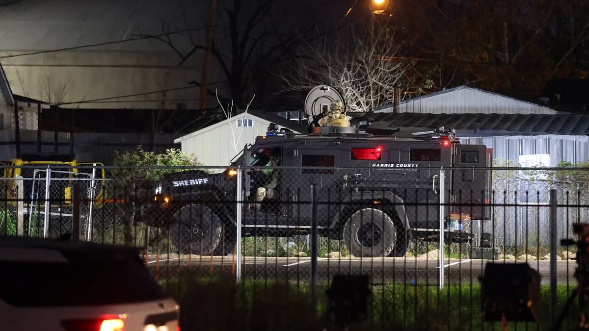 Harris County Sheriff’s officers clear the media from the neighborhood where 42-year-old suspect Shamsud-Din Bahar Jabbar is believed to have lived