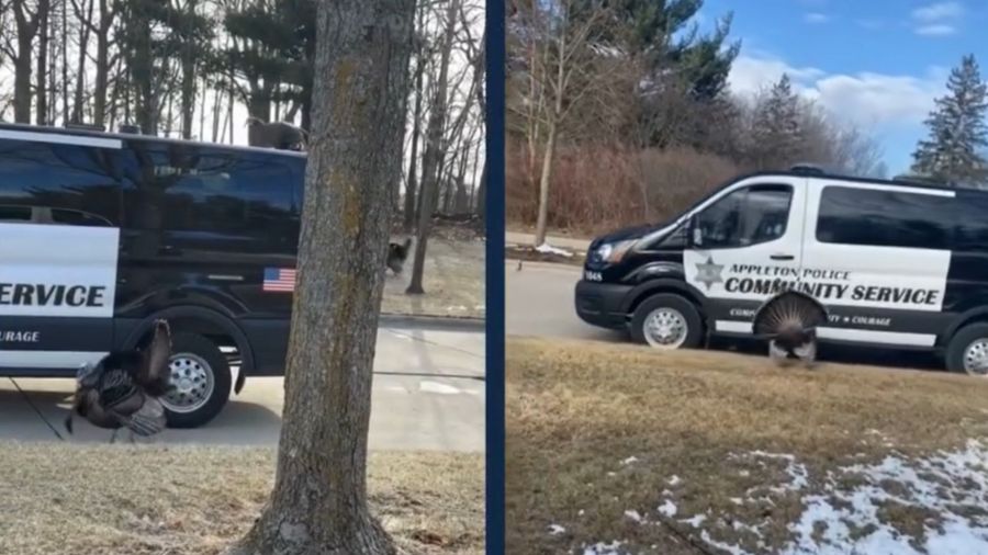 A Facebook post from the Appleton Police Department shows a wild turkey chasing an Appleton PD Community Service vehicle, with officers noting the local rise in the wild turkey population in recent years.