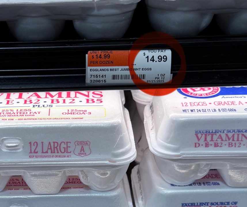 Photo from a supermarket showing the price of a dozen Eggland’s Best eggs being $14.99 (Credit: Carter Christensen)