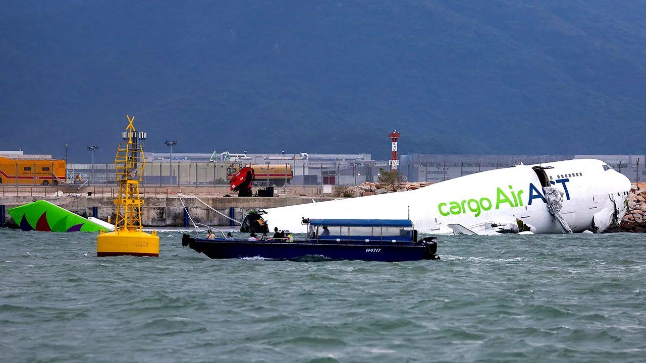 The remains of the AirACT cargo plane, operated for Emirates Airline, were found near the runway at Hong Kong International Airport on Monday, October 20, 2025.