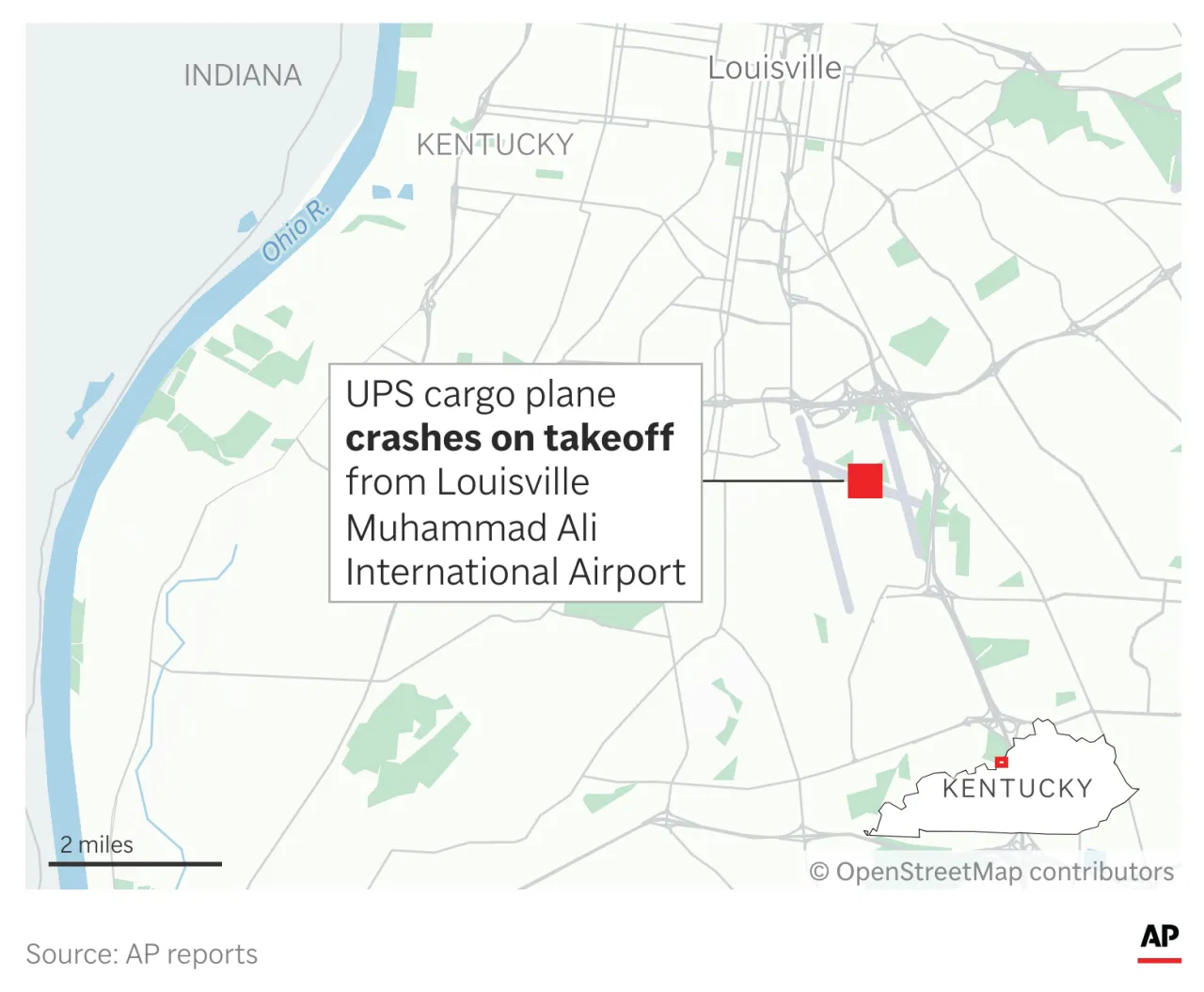 A UPS cargo plane crashed and exploded in a massive fireball Tuesday while taking off from the company’s global aviation hub in Louisville, Kentucky, killing at least three people and injuring 11. (AP Digital Embed)