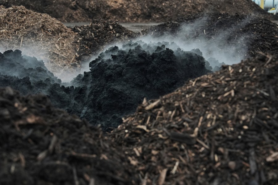 In Columbus, the city takes half of these dirt-like biosolids to a composting facility nearby, where they are mixed with other organic material like trees and leaves and turned into compost after an additional round of heating and aeration to further kill off pathogens. These biosolids are less regulated and can be used on land such as parks or a residential yard.
