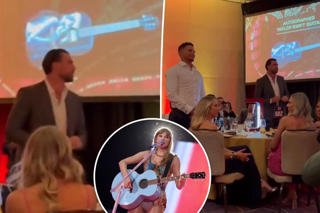 Travis Kelce made a joke at Patrick Mahomes’ charity event Thursday night when he noticed a guitar autographed by Taylor Swift was up for grabs.