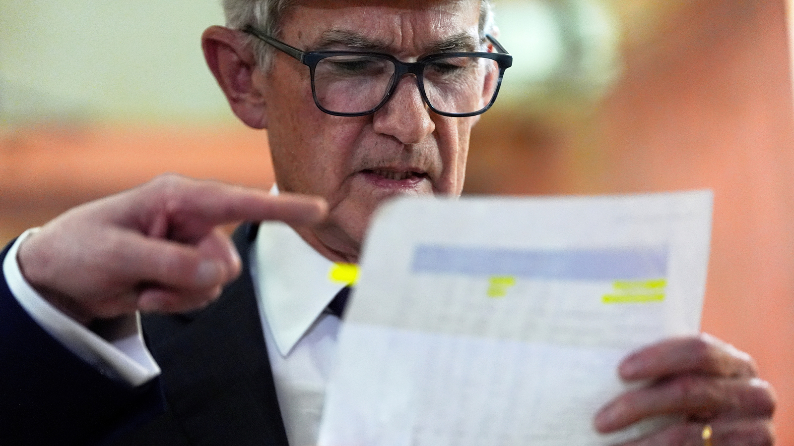 Federal Reserve Chairman Jerome Powell looks over a document as President Donald Trump points during a visit to the Federal Reserve, Thursday, July 24, 2025, in Washington.