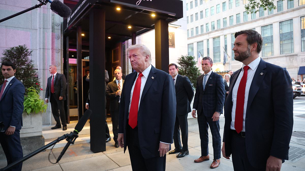 President Donald Trump (center) stands outside of Joe's Seafood, Prime Steak & Stone Crab in downtown Washington, D.C. alongside (from left) Secretary of State Marco Rubio, Secretary of War Pete Hegseth and Vice President J.D. Vance ahead of dinner Tuesday night