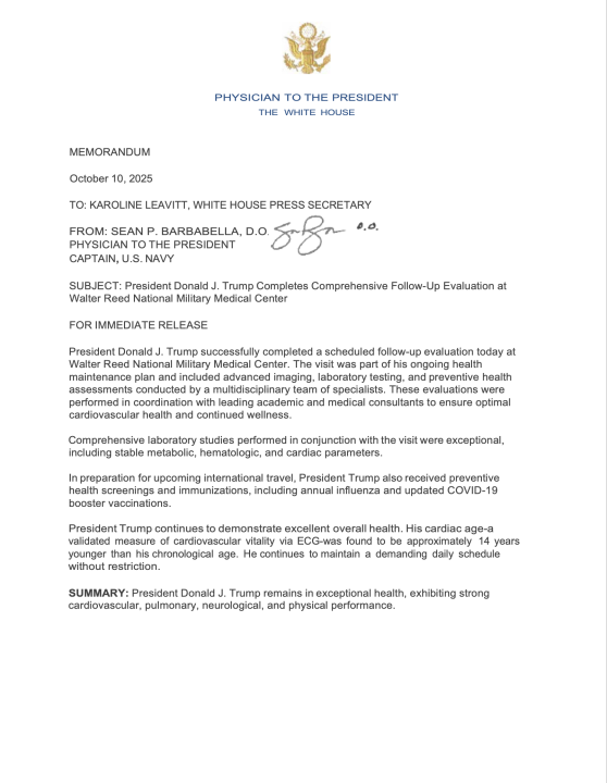 In a letter to White House Press Secretary Karoline Leavitt, Trump’s doctor said the president is in “excellent overall health … exhibiting strong cardiovascular, pulmonary, neurological, and physical performance.”