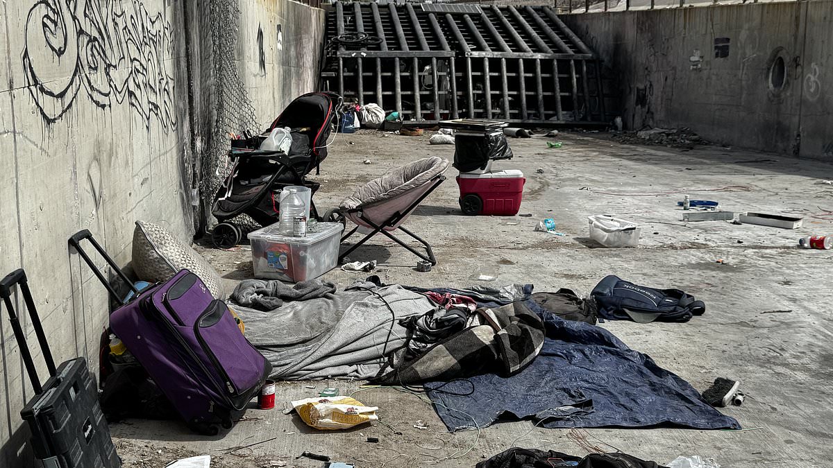 Another unhoused person returns to the tunnel carrying items he may have picked up