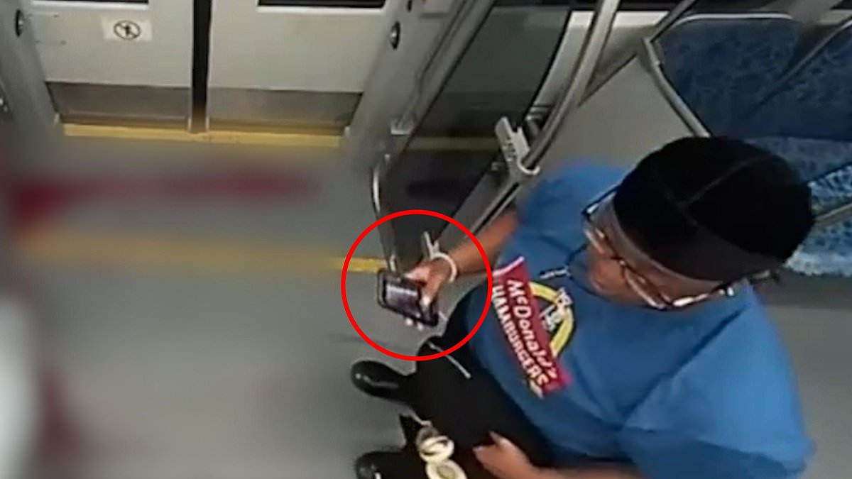 An unknown man dressed in a blue McDonald’s t-shirt, durag and glasses pulled out his phone to record Iryna Zarutska as she bled out on the train in Charlotte, North Carolina