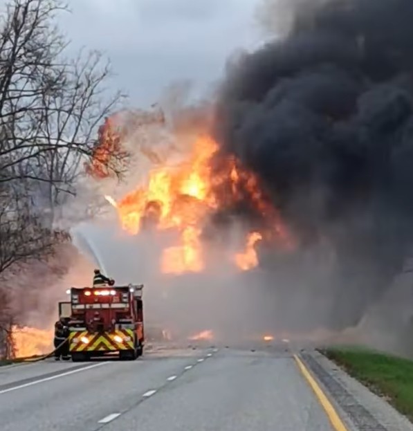In the footage, large plumes of fire and smoke can be seen engulfing all lanes of the interstate.