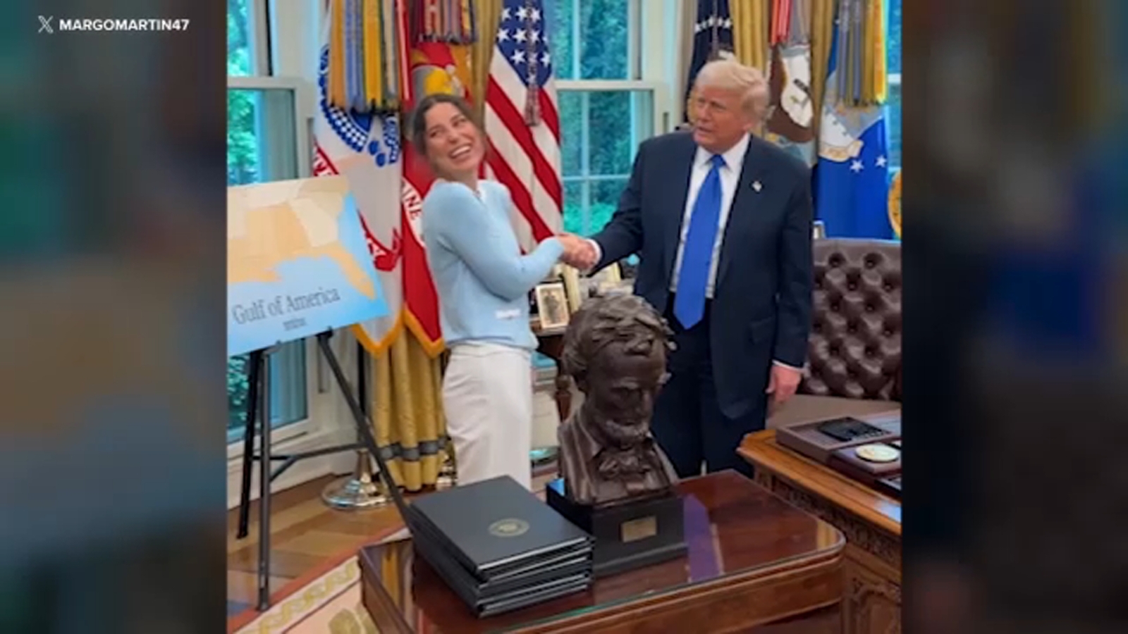 “It’s a great honor,” the president said while shaking Karelina’s hand, as seen in a video clip posted by the White House on social media. He prompted laughter when he said to someone who was off-camera: “Now I know why you fought so hard to get her out of there.”