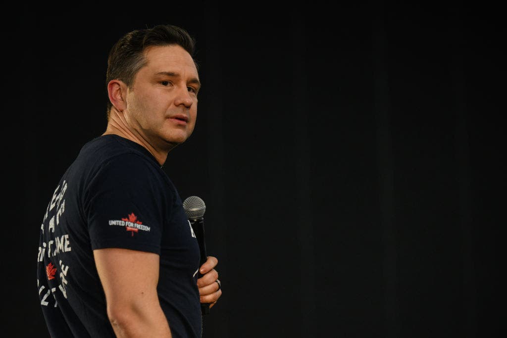 Leader of Canada’s Conservative Party, Pierre Poilievre, speaks during at a rally in Edmonton, on March 27, 2024, in Edmonton, Alberta, Canada. (Artur Widak/NurPhoto via Getty Images)