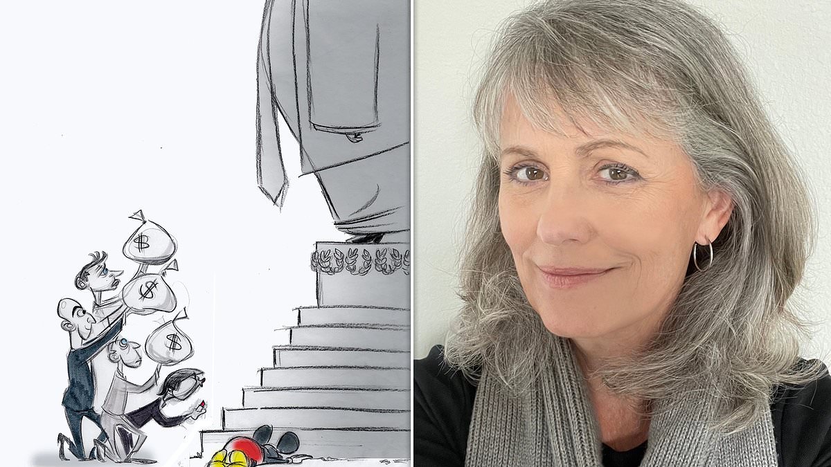 Ann Telnaes said Friday she drew a cartoon showing a group of media executives bowing before Trump while offering him bags of money, including Post owner and Amazon founder Bezos